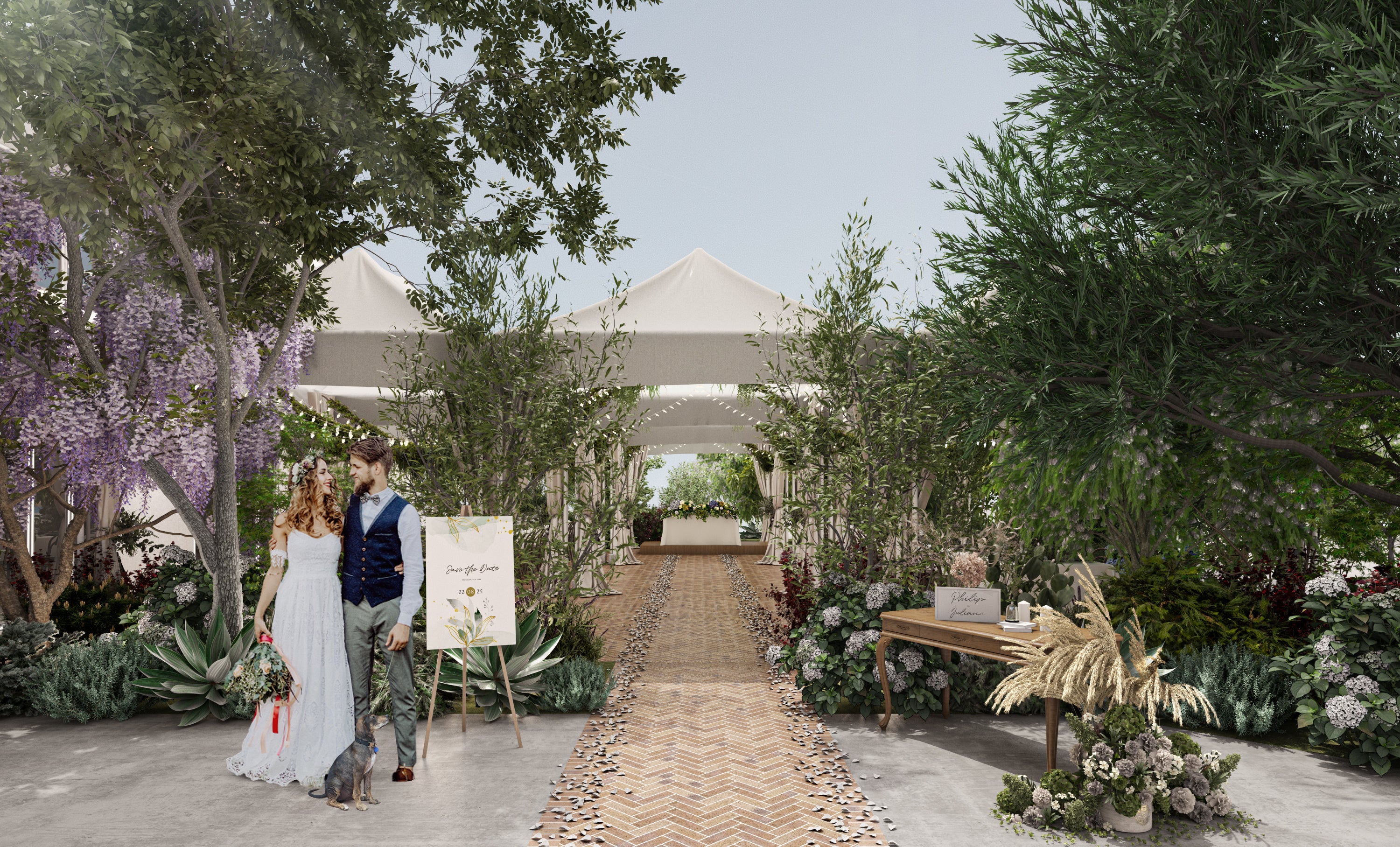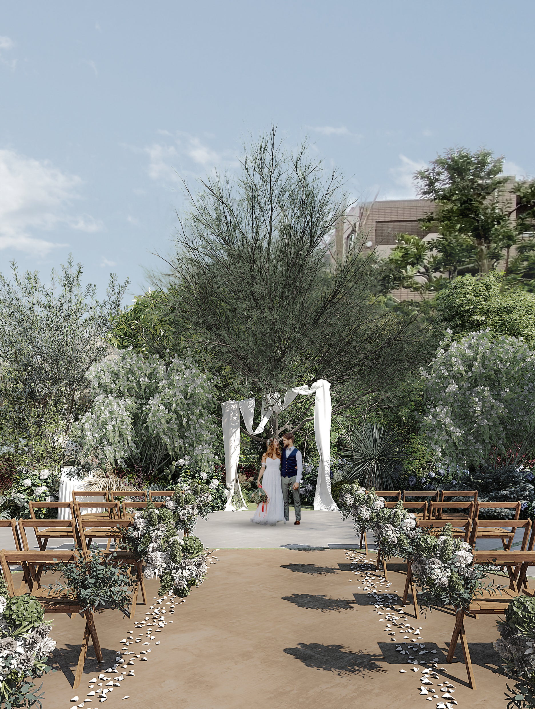 本施設のガーデンデザインは、植物を主体とした空間設計を手がけるYard Worksによるものです。大切な人たちと人生の節目を祝う場所として、どの季節に訪れても花々を楽しめるよう、日本特有の四季によって咲く花を計算して配置しています。多様な花で溢れる春はもちろん、夏には鎌倉らしい紫陽花や百日紅など、春、晩春、夏、晩夏、秋、冬に咲く花を計算して配置しています。さらに、秋には紅葉、冬には少なくなった草木の中で顔を出す小さな実や常緑樹などが見られます。また敷地内では、区画により異なる世界観を持たせています。エントランス部分は将来的に樹木のトンネルができるような植栽計画で、テラス席周辺には日陰でも育つウェットな世界観が展開されます。BIRD HOTELという名前にちなんだ鳥の水場(バードバス)を設置し、鎌倉店とは異なる世界観のガーデンが年々育っていく過程も楽しめます。