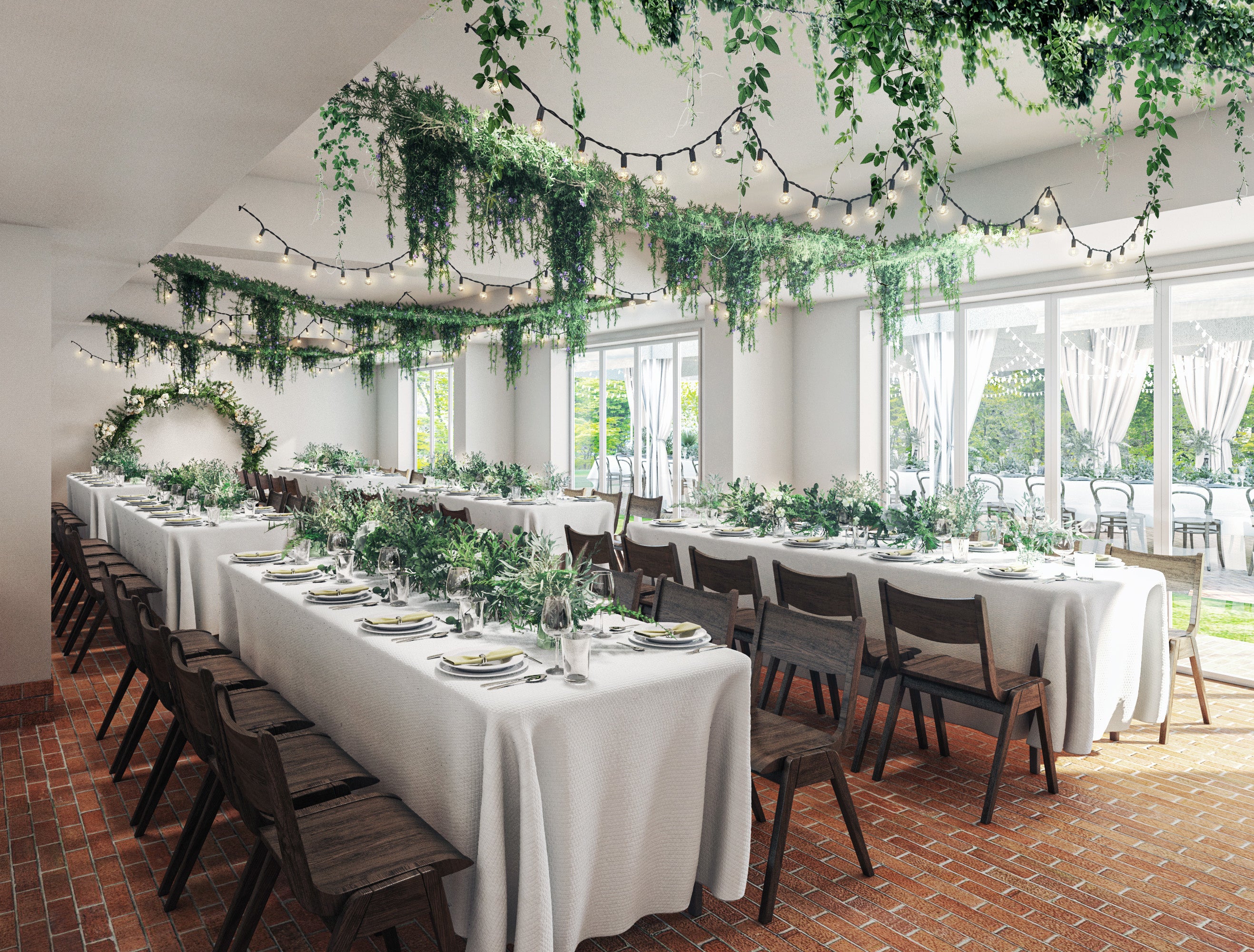 レストラン区画は、バー、バンケット、ガーデンを臨むテラス席で構成されており、家族のお祝い事、友人との誕生日パーティーなど小中規模の団体予約から、ウェディングを含む施設を貸し切ったイベントまで、様々な用途で利用可能です。ウェディングにおいては、専属のウェディングプランナーが在籍し、最大80名規模の挙式・披露宴が可能です。