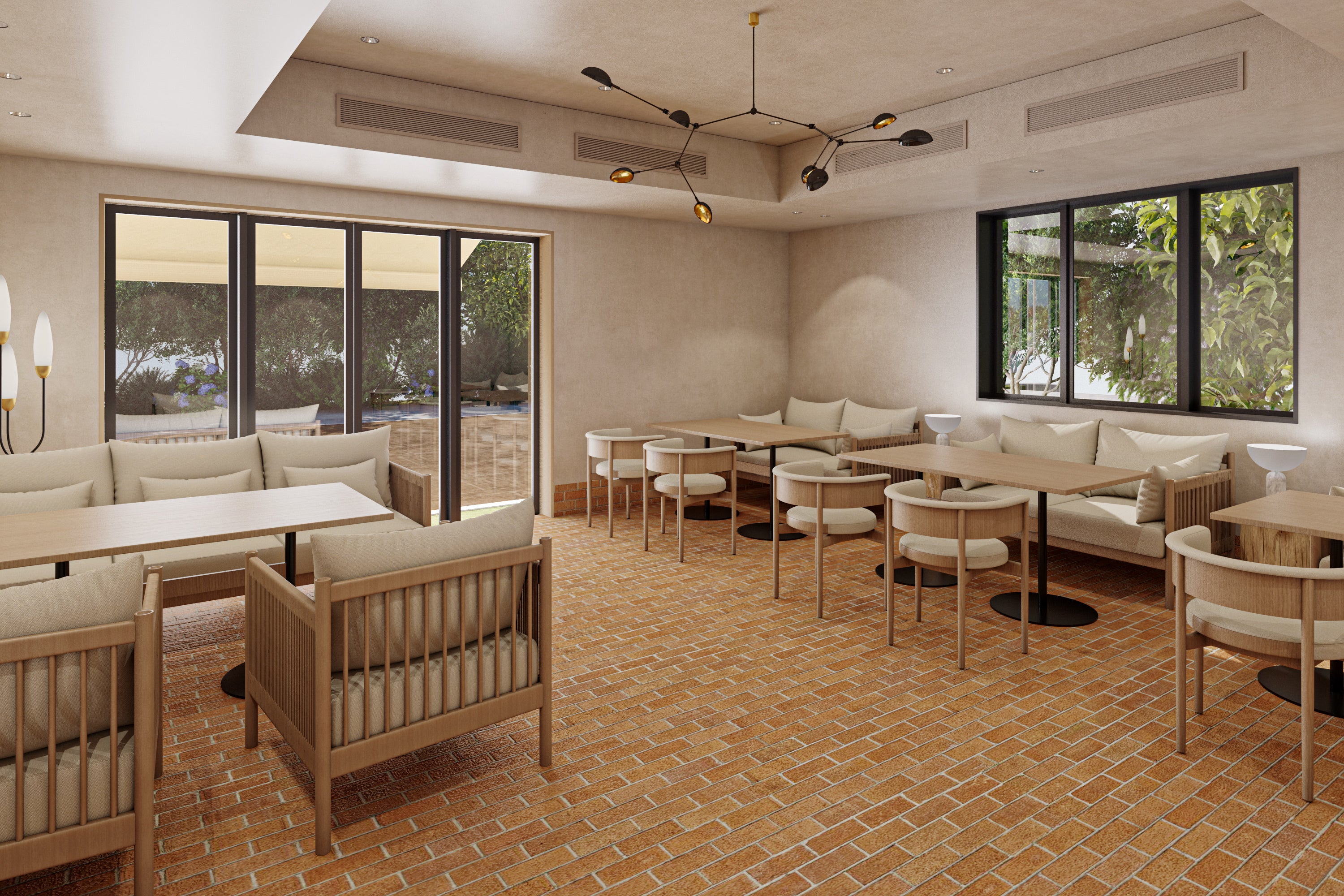 既存の躯体で大半を占める印象的な煉瓦タイルと、大きく波打つ漆喰といった有機的な形を残しながら、家具や造作などは削ぎ落として極力シンプルにまとめました。煉瓦タイルはテラス席部分にまで拡げ、内外をつなぎ開放的な空間に。レストランの店内席とテラス席をつなぐ開口部も広く取ることで、ガーデンの移ろう四季の空気を室内でも感じられるように改築しました。