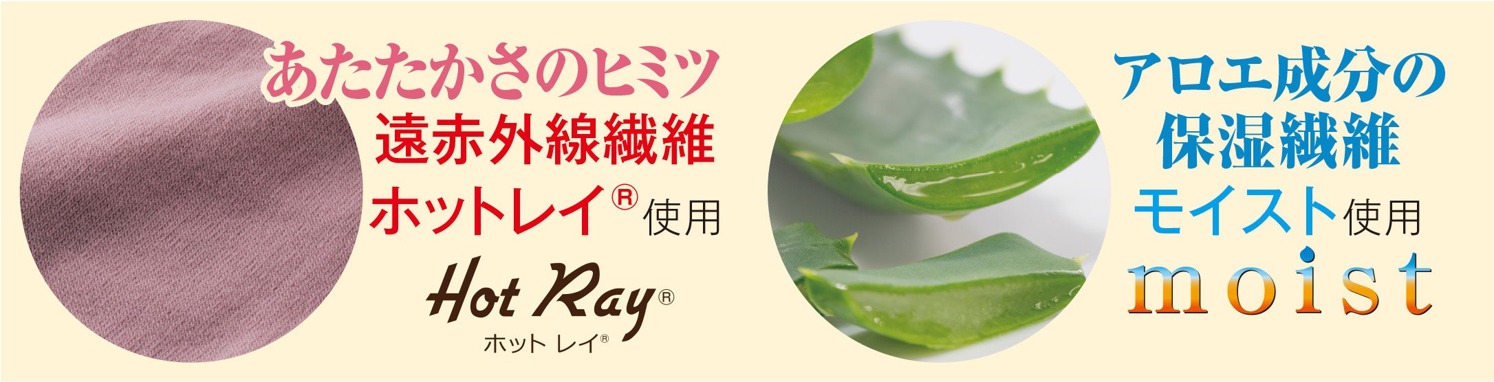 セラミックを練り込んだ遠赤外線繊維「ホットレイ®」とアロエの保湿成分を練り込んだしっとり繊維「モイスト」をダブルで使用し、着心地の良さとあたたかさにこだわりました。