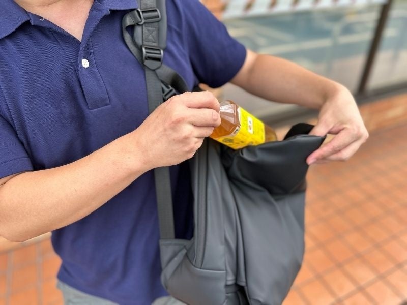 いちいちリュックを下ろして荷物を出し入れするのは大変。なので上からポンッと入れた飲み物は、下からサッと取り出せるようにしました。いつでも身近にあるコンビニのように便利な存在です。