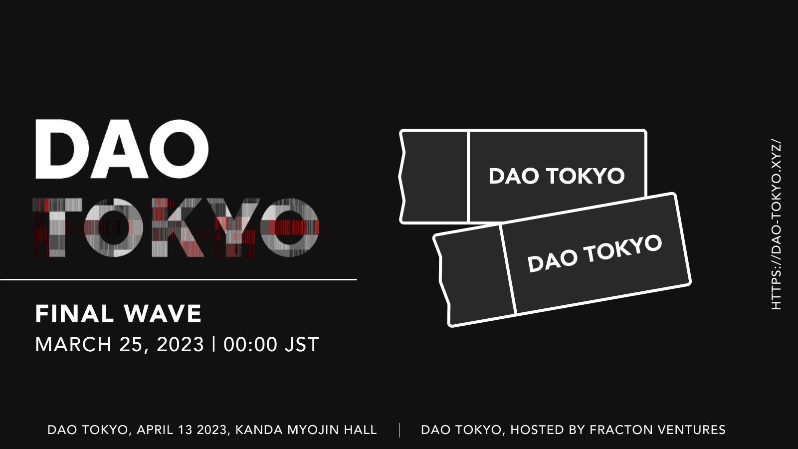 Fracton Ventures株式会社(本社:東京都品川区、代表者:鈴木雄大、亀井聡彦、赤澤直樹 以下 当社)は、この度、2023年4月13日に開催するDAO(Decentralized Autonomus Organization)領域に特化したカンファレンスDAO TOKYOの登壇者及びサポーターを発表致します。また最終チケット販売となるWave3を本日3月25日AM0:00 (日本時間)より開催いたします。