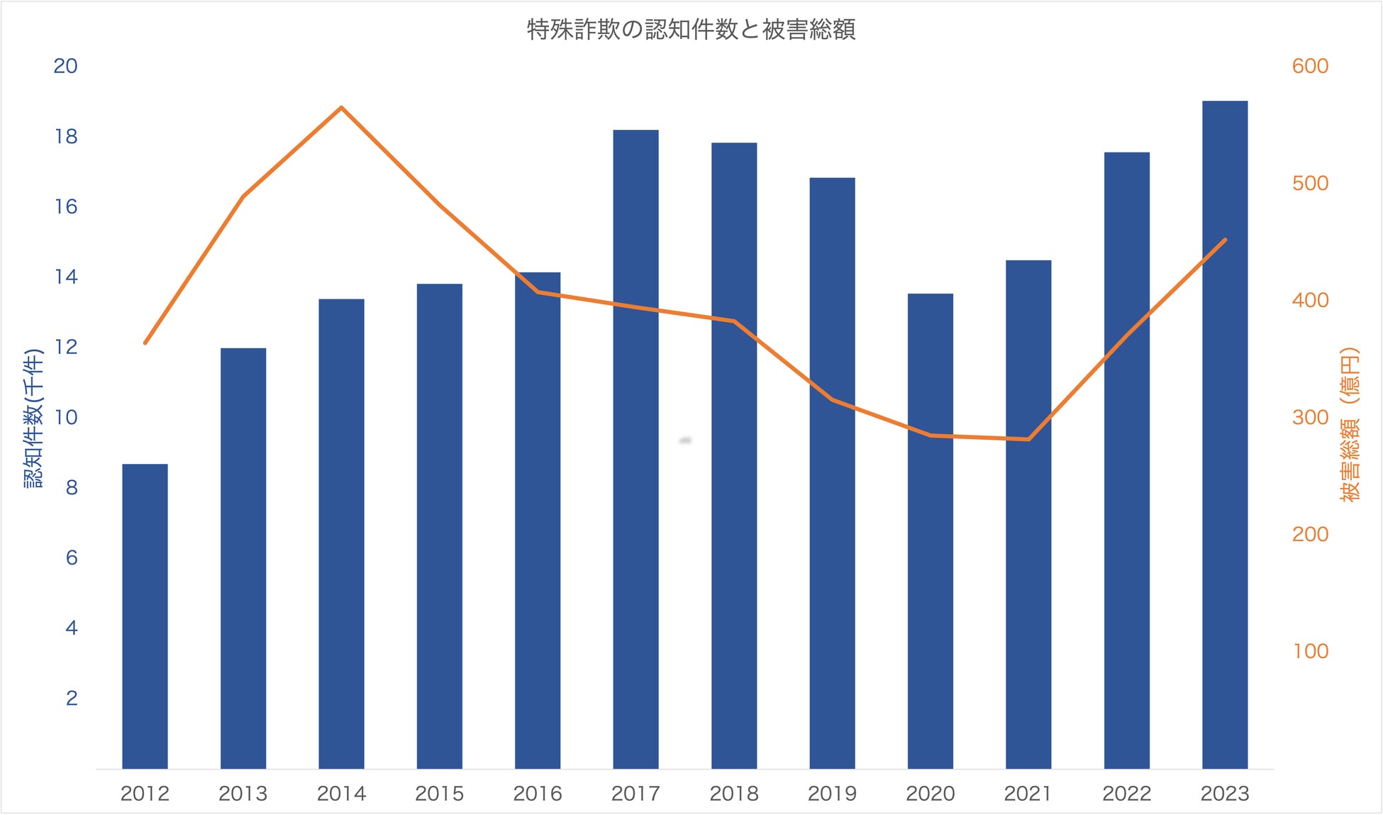 「オレオレ詐欺」をはじめとする特殊詐欺は、2014年には被害総額が過去最⾼の約566億円となりました。その後、警察による取り締まりの強化や、官・⺠が連携した予防活動、犯⾏使⽤電話の利⽤制限といった対策の実施等により⼀旦は減少に向かったものの最近は再び増加基調にあり、2023年の特殊詐欺の認知件数は約1万9,000件、被害総額は約453億円となるなど依然として厳しい状態が続いています。(図1)