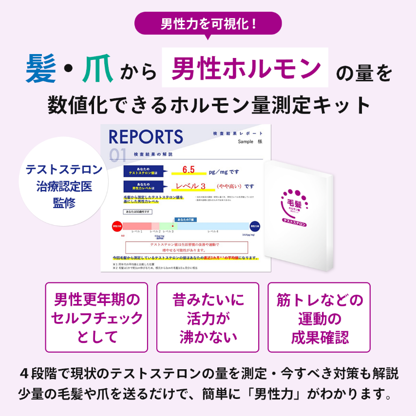 本製品は髪の毛や爪からテストステロン量を測定し、テストステロン量のレベルを4段階評価で確認できます(同年代における位置付け)。