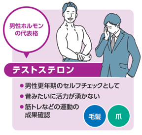 男性ホルモンの代表格である「テストステロン」は、筋肉や骨の形成を促し、生殖機能にも大きな役割を果たします。また日々のバイタリティーやモチベーションなど、心身の健康維持にも大きく関わっています。