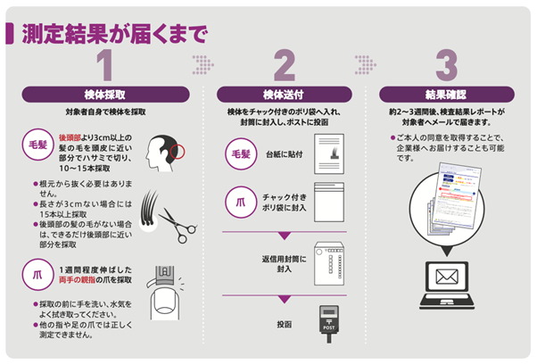 本製品は毛髪・爪のうちお好きな検体から測定ができます。毛髪による測定キットは先行して4月より販売開始。爪による測定キットは5月からの販売を予定しております。