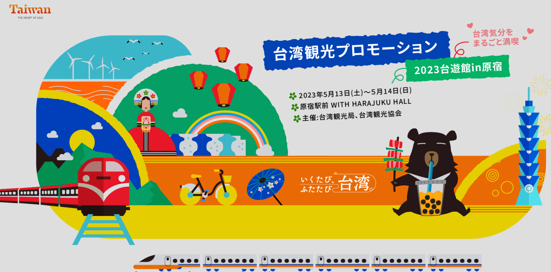 台湾観光局・台湾観光協会は2023年5月13日(土)~5月14日(日)の期間中、原宿駅前のWITH HARAJUKU HALLにて「2023台遊館」を開催します。