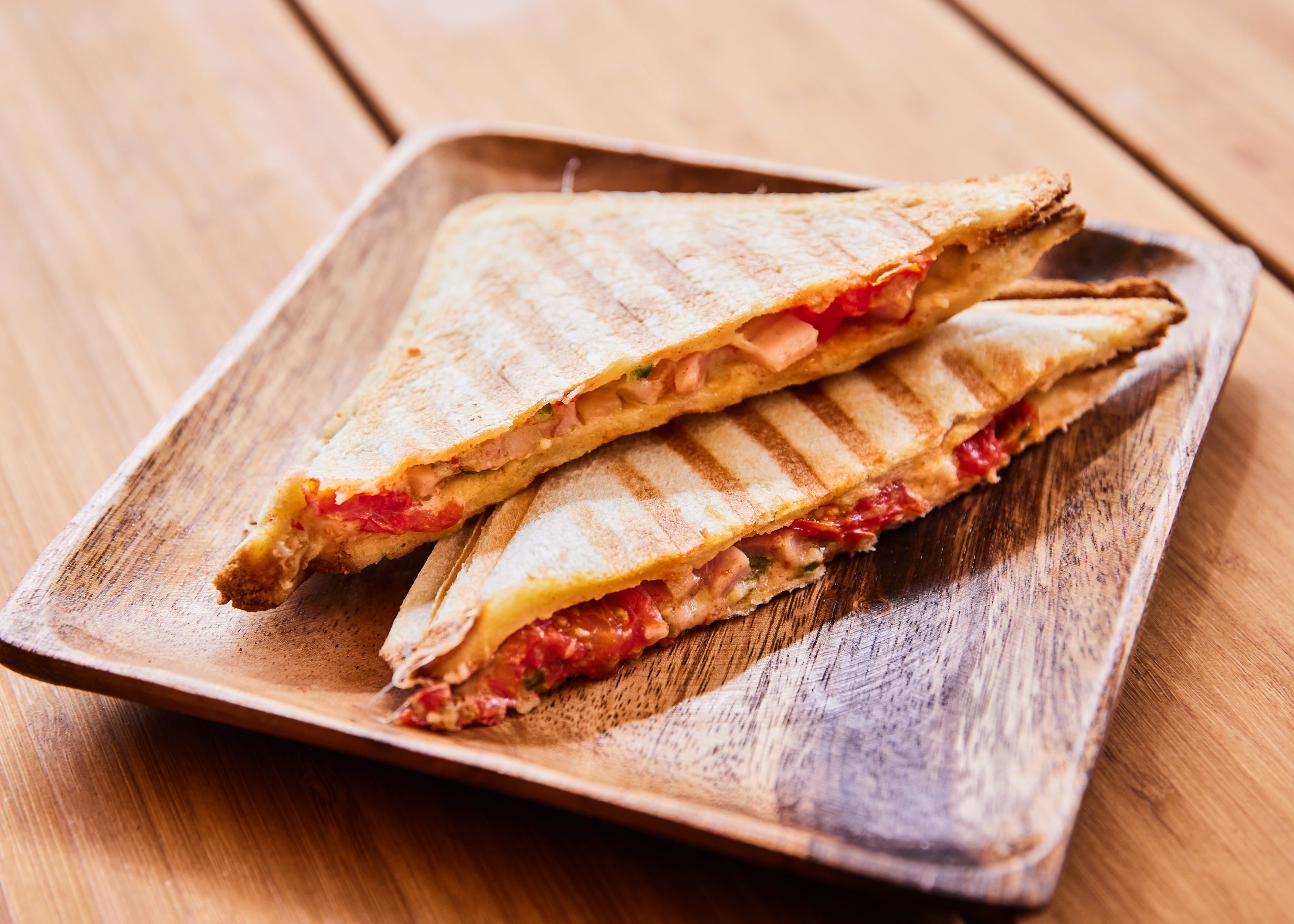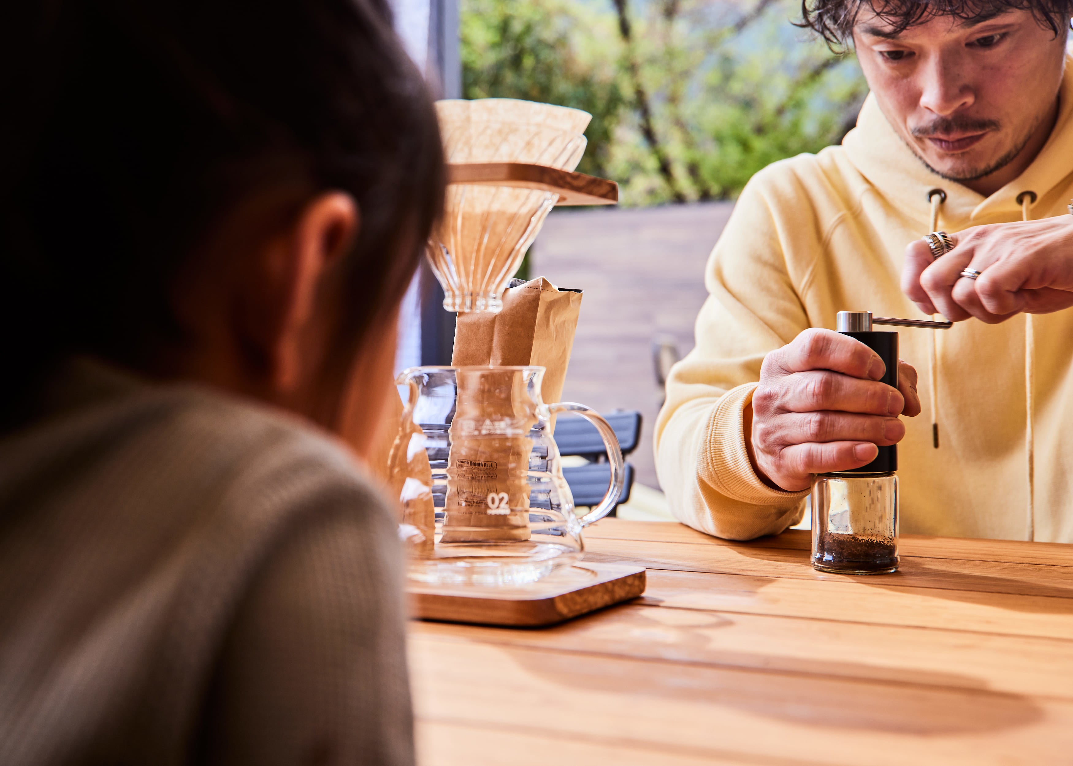 朝は近露の自家焙煎珈琲店「CABELO」から取り寄せた上質な有機栽培コーヒーを、お客様ご自身で豆から挽いていただきます。朝食には、ベーコンやチーズなどの具材を挟んでつくるホットサンドをご用意しています。