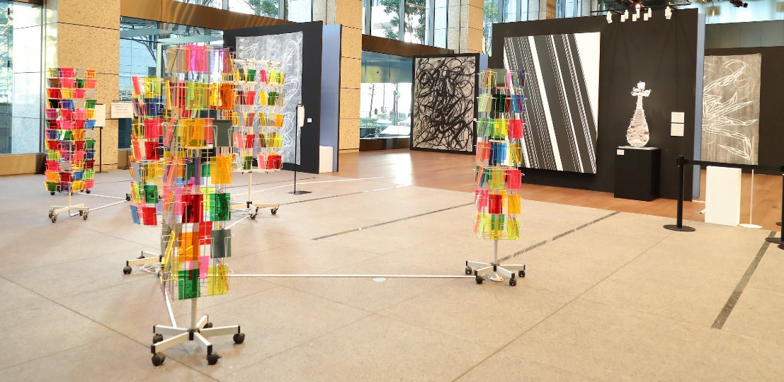 今回のメインターゲットは、アート作品を好んで購入されている富裕層の他に、都心のオフィスで働くビジネスパーソンです。そこで、東京・大手町にある三井住友銀行東館1階という、多くの人が行き交うロビー空間を会場に選びました。ガラス張りのためビルの外から中の様子が見やすく、どなたでも気軽に立ち寄れる場所です。ここ数年、既成概念にとらわれない自由な思考法である「アート思考」がビジネスパーソンの間でも広がりつつあります。現代アートからビジネスのヒントを得ていただくとともに、アートを身近に感じていただきたいと考えています。また、写真撮影やSNSへの投稿も歓迎です。SNSで拡散することで、より多くの方にアートへの関心を持ってもらいたいという思いからです。