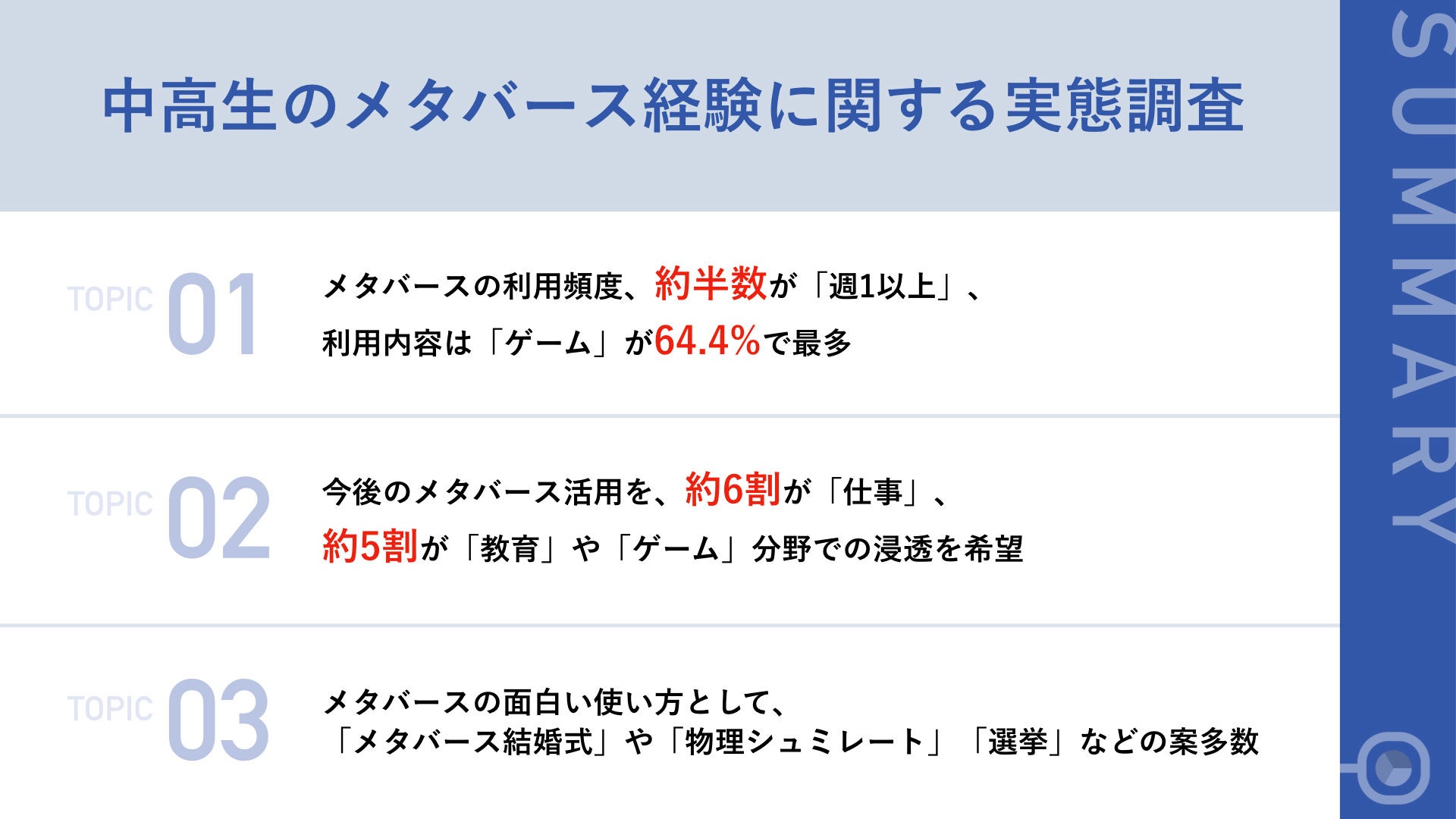まだまだ発展途上であると考えられる「メタバース」技術ですが、中高生のアイディアとして「結婚式」や「選挙」にも使えるのではないかという案もありました。新たな技術の活用には柔軟な発想が求められ、アイディア次第ではその活用方法が主流となることもありえます。多くの企業が参入を検討する「メタバース」の世界で、画期的な新サービスの登場を待つ中高生も多いようです。