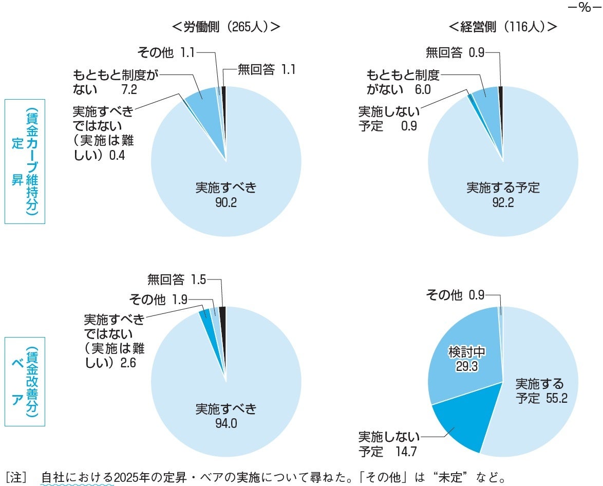 25年の定期昇給(定昇)については、労使とも「実施すべき」「実施する予定」が約9割と大半を占める。ベースアップ(ベア)について、労働側は「実施すべき」が94.0%で大半を占め、経営側は「実施する予定」が55.2%で、「実施しない予定」の14.7%を大きく上回る