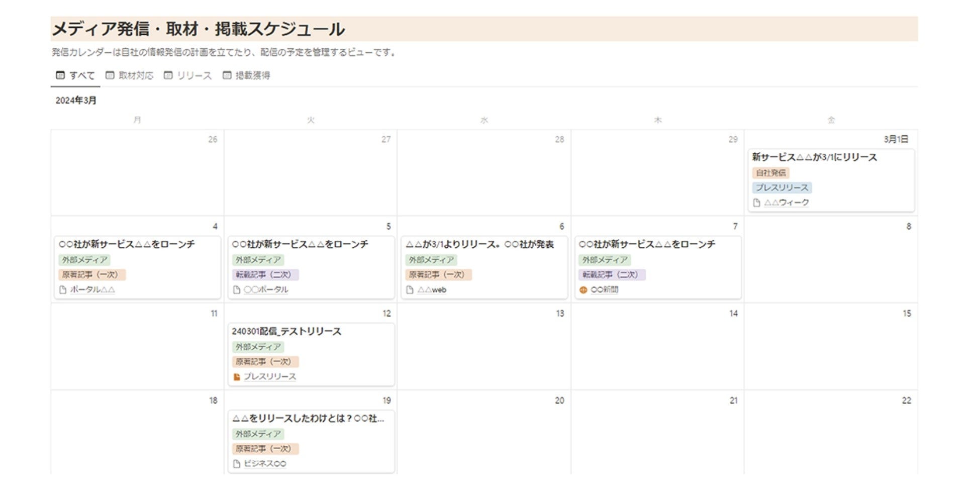 プレスリリースや取材対応など、情報発信に関わる業務の進行管理が可能です。配信日や対応日に応じて、広報クラウド for Notion上のカレンダーに自動反映されるため、広報プロジェクトが一目で把握できます。