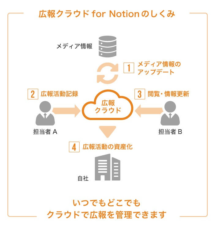 広報専用ツール「広報クラウド for Notion」が、3年の開発を経てついに完成しました。このツールは、Webアプリ「Notion」上に構築されており、リモートワーク環境においても複数の担当者が同時に情報の入力や更新作業を行えます。入力された情報は、担当者が代わっても会社にとって貴重な広報資産となり続けます。些末な業務を最小限に抑え、本質的な広報活動に全力で集中できる環境をお約束します。