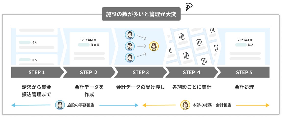 事業所様ごとに独立した管理を行っている場合、各事業所様の事務担当者様が、会計データの作成から、メールでの本部へのデータ送付、その上で本部の担当者が集計と会計処理を行う手間が発生しており、本部のご担当者様は各事業所様へ集金の進捗状況を確認する必要がありました。