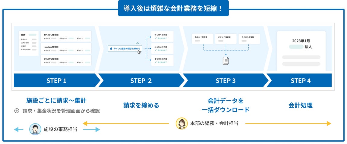 本部の担当者が自ら必要な情報の確認やダウンロードを実施することができるため、各事業所様の事務担当者様、本部の総務・会計担当者様の双方が以下のように快適にご利用いただけます。