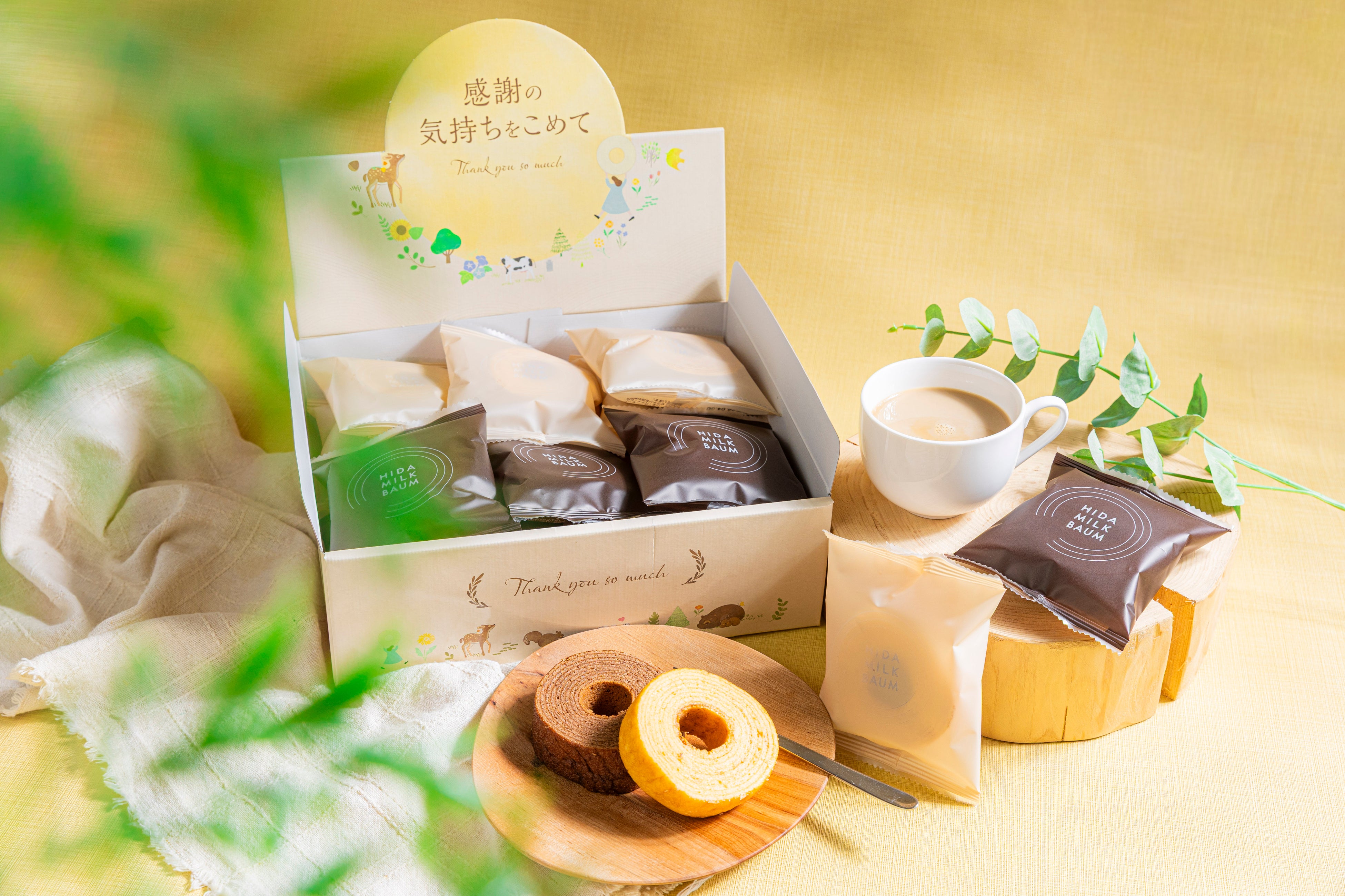 バームクーヘンの幾重にも重なる年輪を、職場の仲間と一緒に積み重ねてきた時間に重ね合わせました。そこに飛騨の森の四季を感じるモチーフをあしらうことで、言葉で尽くせない感謝の想いを、飛騨の自然の温もりとともに届けます。