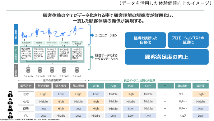 MIRARTHホールディングスは、「サステナブルな環境をデザインする力で、人と地球の未来を幸せにする。」というパーパスを実現するために、お客さまに寄り添い、お客さまにとってより良いサービスの提供の実現を目指してきました。多様化するお客さまの価値観や環境の変化に対応するために、MIRARTHホールディングスが保有するデータを活用し、お客さま一人一人に寄り添った、最適なコミュニケーションを行うことで、お客さまの体験価値の最大化をさらに推進していきます。