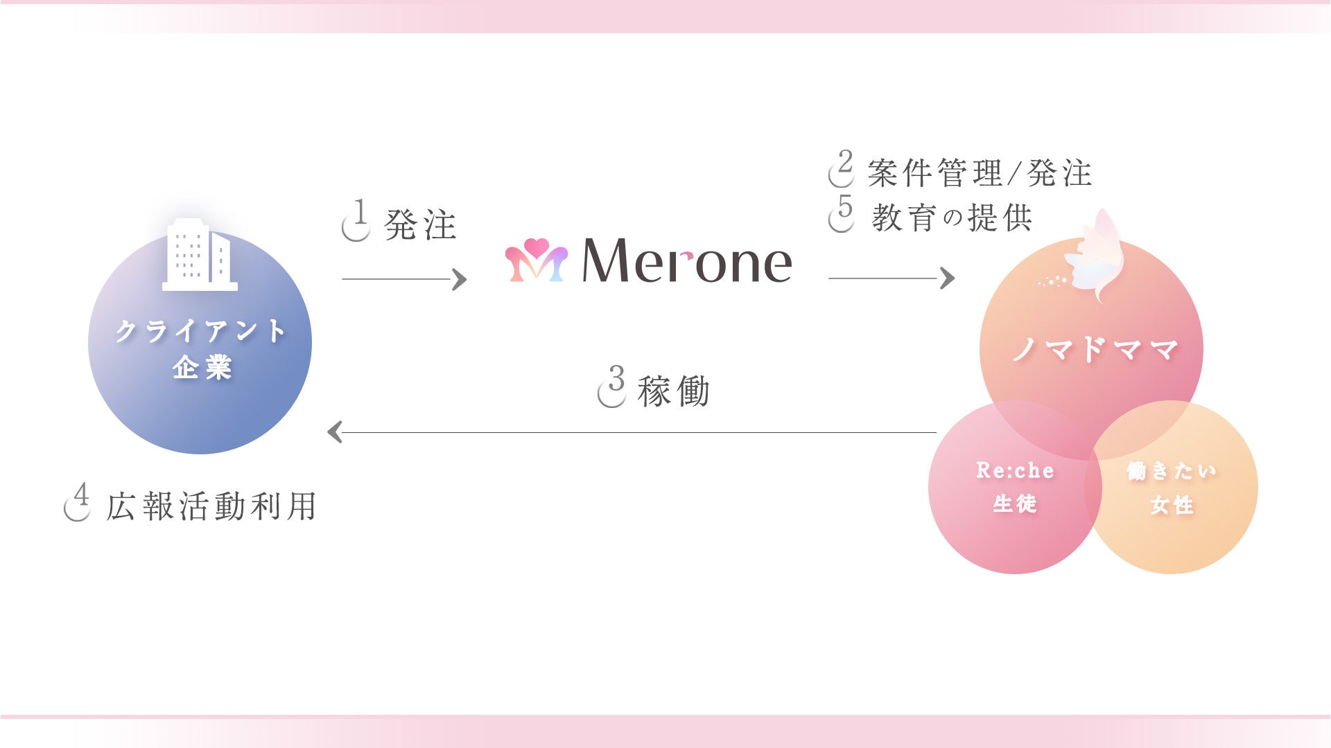 Meroneには既に多くの”働きたい女性”が在籍しており、Meroneが顧客企業から受注する業務を働きたい女性へご紹介します。