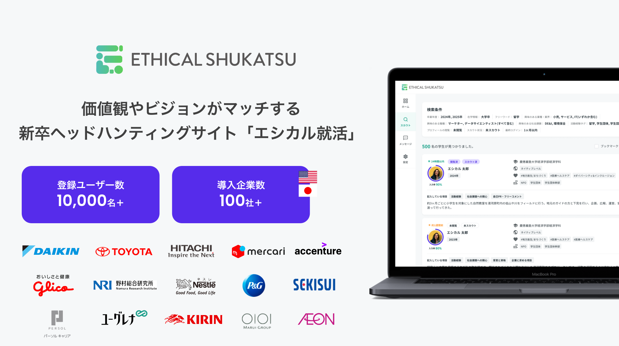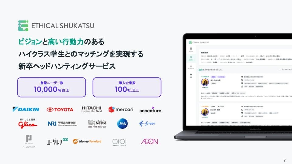 同社が展開する、企業理念や価値観が合うハイクラス学生と出会えるスカウト型採用プラットフォーム『ETHICAL SHUKATSU』は2021年5月のリリース後、導入企業は日米100社以上、登録ユーザー数は約10,000名を突破。
