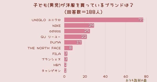 ARINA株式会社が運営する幼児、小学生の親御さん向けの教育メディア「おうち教材の森」(https://naki-blog.com/study/)は、日本全国の中学生以下のお子さんをお持ちの親御さんを対象に「子ども(男児)が洋服を買っているブランドは?」とアンケート調査を実施しました。その結果を公表します。