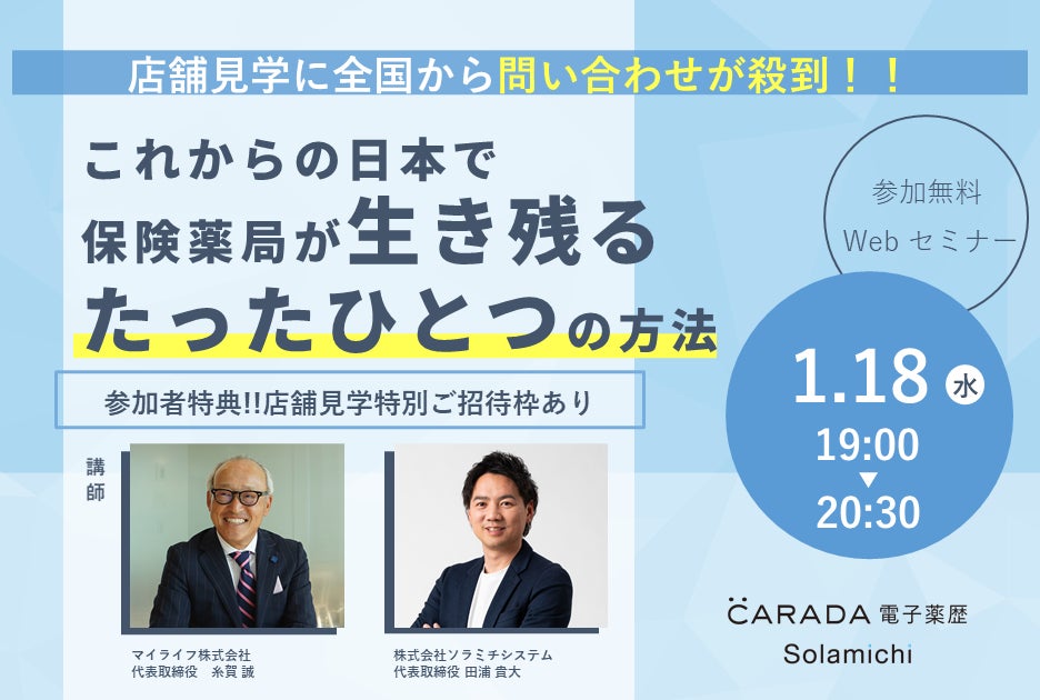 クラウド電子薬歴『CARADA 電子薬歴 Solamichi』の企画・開発・販売を行う株式会社ソラミチシステムは、薬局事業、医業経営コンサルティング事業を展開するマイライフ株式会社の代表取締役 糸賀誠氏をゲストに迎え、無料オンラインセミナー「これからの日本で保険薬局が生き残るたったひとつの方法」を2023年1月18日(水)19時より開催します。