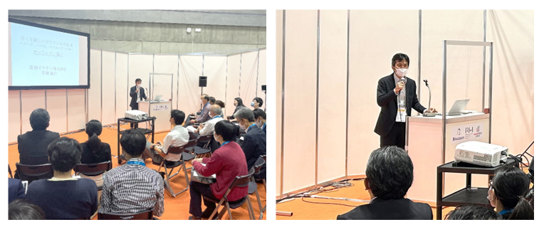 また、バイオメディカル部長 平岡陽介による「古くて新しいゼラチンの可能性 ~フード、ヘルス、バイオメディカル」と題した出展社プレゼンテーションにおいて「製品ライフサイクル」と「運ぶ」をキーワードに、ゼラチンの医療用途への使用実績紹介やゼラチンを用いた細胞輸送等についてご説明し、用意された席数を大きく上回る人数の方に聴講いただきました。