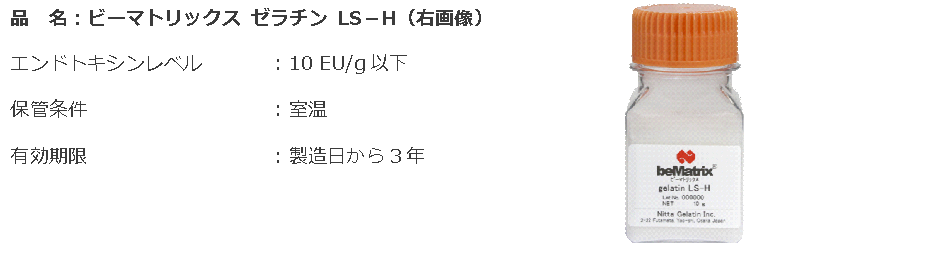 様々な研究・開発用途や目的に応じてお選びいただけるよう、原料由来や処理が異なる製品ラインナップを豊富にとり揃えた低エンドトキシンのゼラチンです。目的に応じ、ゼラチンの由来や処理をお選びいただけます。エンドトキシンの管理が必要な実験、医療機器の原材料用に適しています。