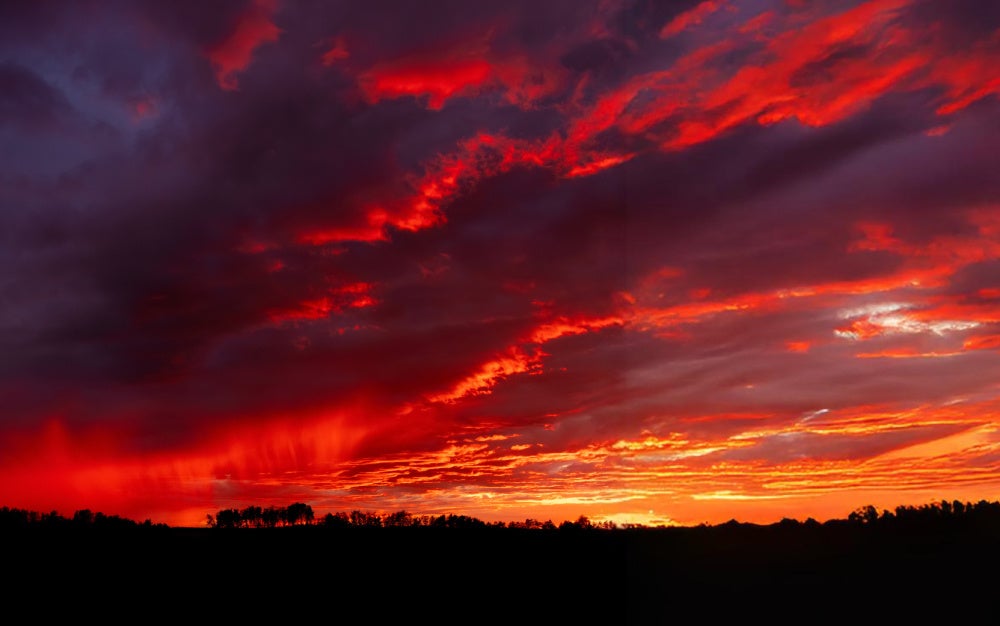 赤やオレンジの混ざり合う夕日の鮮烈さを感じさせながらも、ほのかに夜の気配を漂わせるような絶妙に落ち着いた色合いは、夕日の存在感と黄昏時のうつろいを同時に感じさせる仕上がりとなっています。