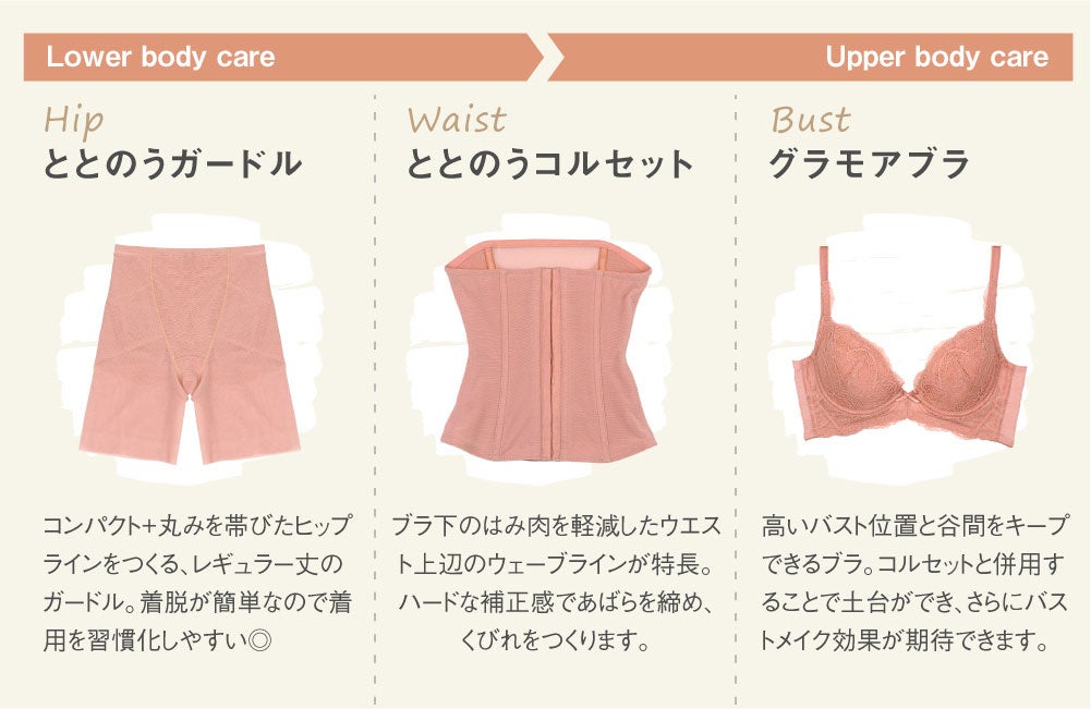 「コルセットがバストの土台を作り、あばら締めで自然と姿勢がととのう」というメソッドを採用してデザインされているので、同色のブラとセットでの着用もおすすめ。更に、”トータル美”を実感できる組み合わせとして、「ととのうガードル レギュラータイプ」とセットでの着用が特におすすめです。