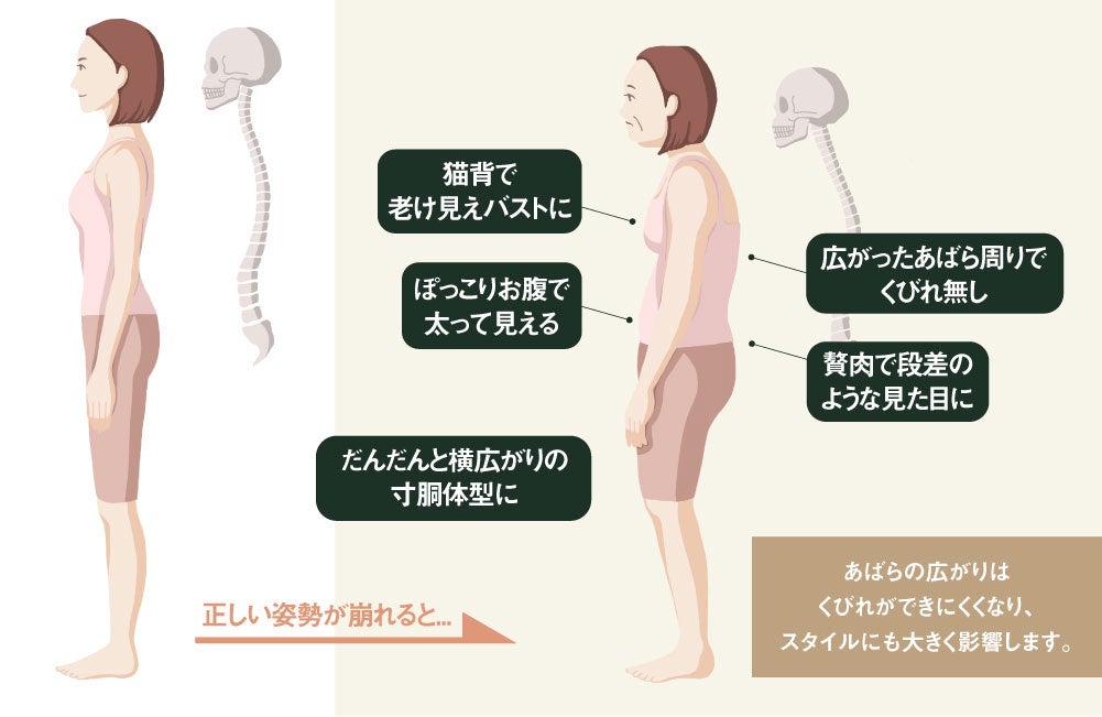 あばら骨(肋骨)が開いていると、内臓が下がりぎみになり「ずん胴」に見えます。「ととのうコルセット」の着用で物理的に骨格をサポートしてあばらを締めた状態では、ウエストの高い位置にくびれが生まれるだけでなく、足長に見えるというメリットもあります。“あばら締め”は最近、体型が気になる方を中心に注目されており、コルセットは着用するだけで手軽にあばら骨(肋骨)の補整が出来るアイテムとしておすすめです。しかも、毎日着用を続けることで無理なく正しい姿勢を保てるようになり、ボディラインだけでなく、気持ちまでスッキリと整います。