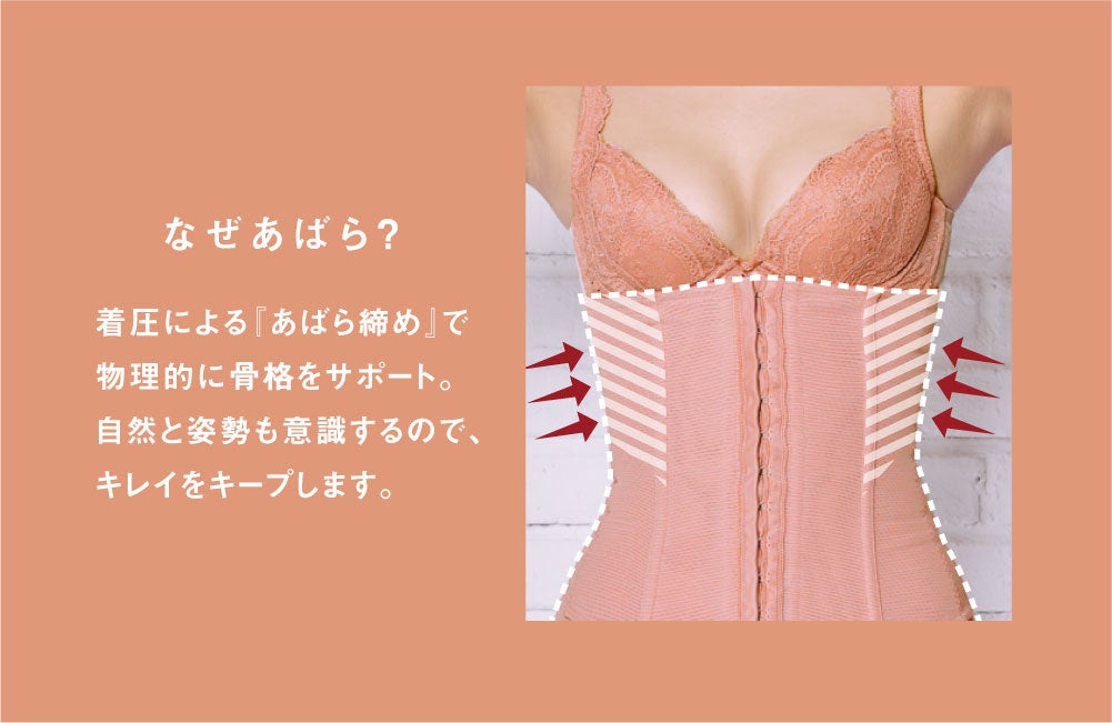 「コルセットがバストの土台を作り、あばら締めで自然と姿勢がととのう」というメソッドを採用。