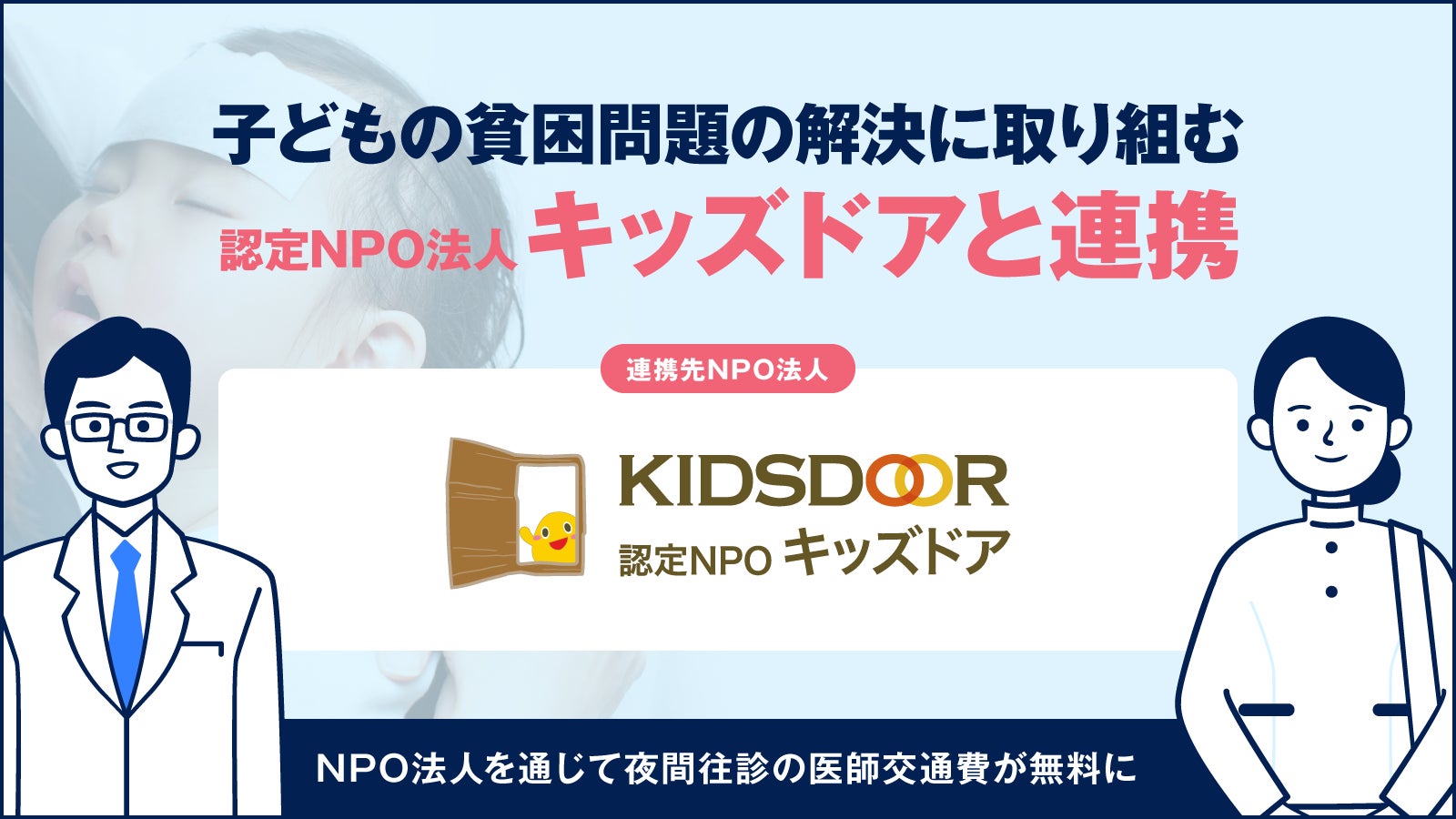この度、キッズドアとノーススターの間で、「全ての子どもの健康を守るため、あらゆる子育て家庭が安心して医療につながる世界を目指したい」という思いが一致したことで、今回の連携が実現しました。認定NPO法人キッズドアが支援する子どもたちや家庭に向け、夜間往診サービス利用時の医師の交通費が無料となるプランの提供を開始します。