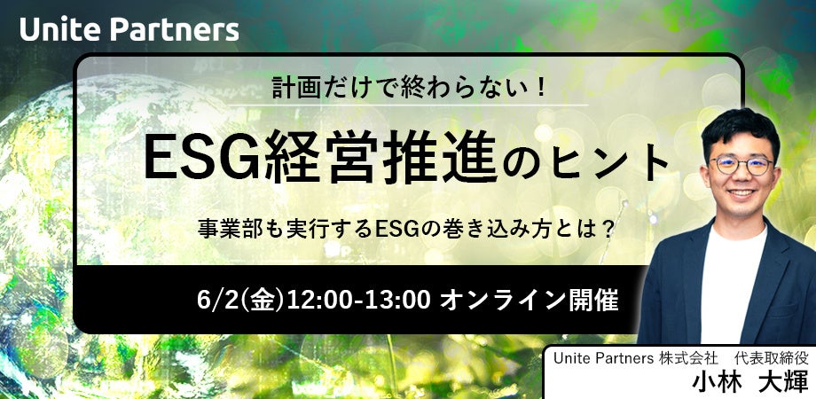企業の変革パートナーを目指すブティック型コンサルティングファームのUnite Partners株式会社(本社:東京都、代表取締役:小林大輝)は、2023年6月2日(金)に、「ESG経営推進のヒント 〜 計画だけで終わらない!事業部も実行するESG推進の巻き込み方とは? 〜 」と題して大企業の経営者や経営企画部門向けのセミナーを開催します。