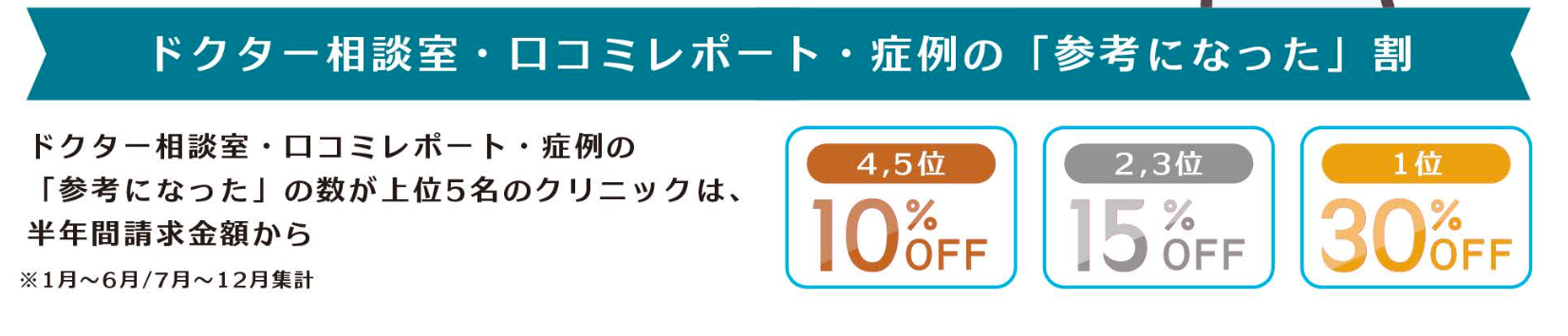「参考になった」割引はドクター相談室や口コミレポート、症例に設置している「参考になった」の数が最も多い5名のドクターが在籍しているクリニックのご請求を半年間、一定の割合で割引するものです。