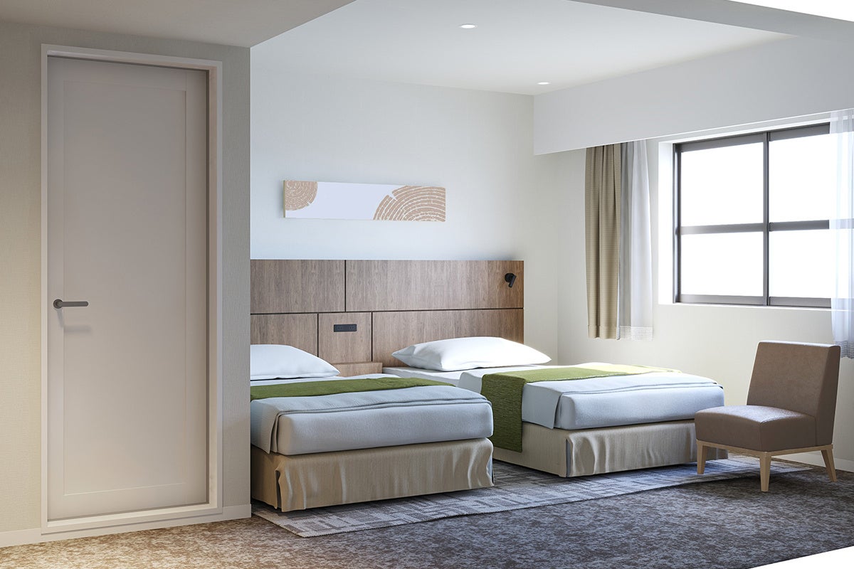 客室は全室禁煙で、ダブルルーム、ツインルーム、トリプルルーム、ファミリールームを全136室ご用意しております。ベッドはシモンズ製のマットレスを導入。機能的で快適にお過ごしいただけます。また、歯ブラシやヘアブラシ、カミソリはバイオマス商品を採用しており、環境に配慮した取り組みを行っております。