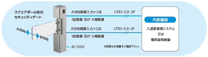 出入口として双方向に開扉:2つの信号で双方向に開閉・入場時カードリーダー、退場時押しボタン可能
