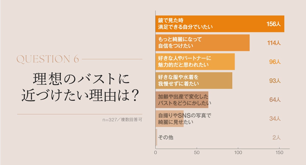 バストを理想に近づけたい理由について回答したのは327人。そのうちもっとも多かった理由は「満足できる自分でいたい(47.7%)」、続いて「自信をつけたい(20.4%)」でした。周囲からの評価や視線を気にするよりも、自分のために理想に近づきたいという女性が多いことが分かります。