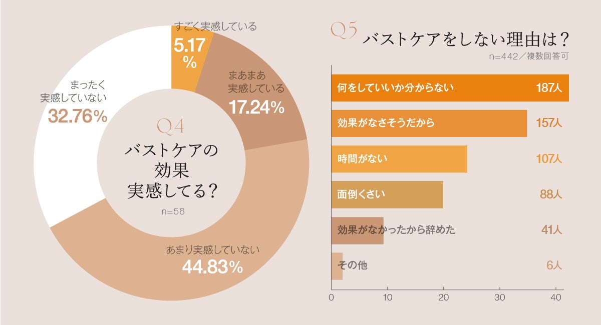 理想のバストが分かっていても、なかなか自力で目指すのは難しいもの。バストケアを行っていると回答した女性のうち、効果を感じていると答えたのはわずか2割程度。大半の方が実感できていないようです。