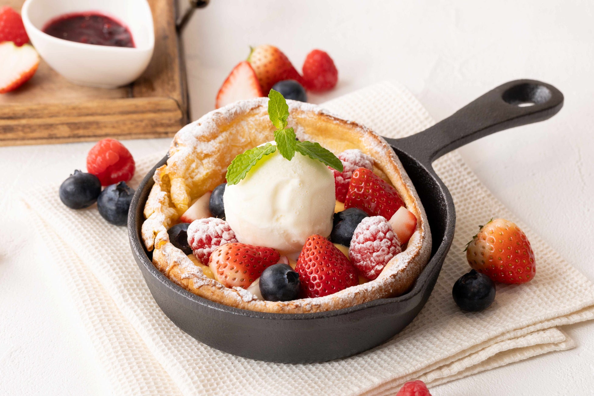 中はもっちり、外はカリカリの生地に、さっぱりとしたカスタードとミルクアイス、季節のフルーツをふんだんにのせました。