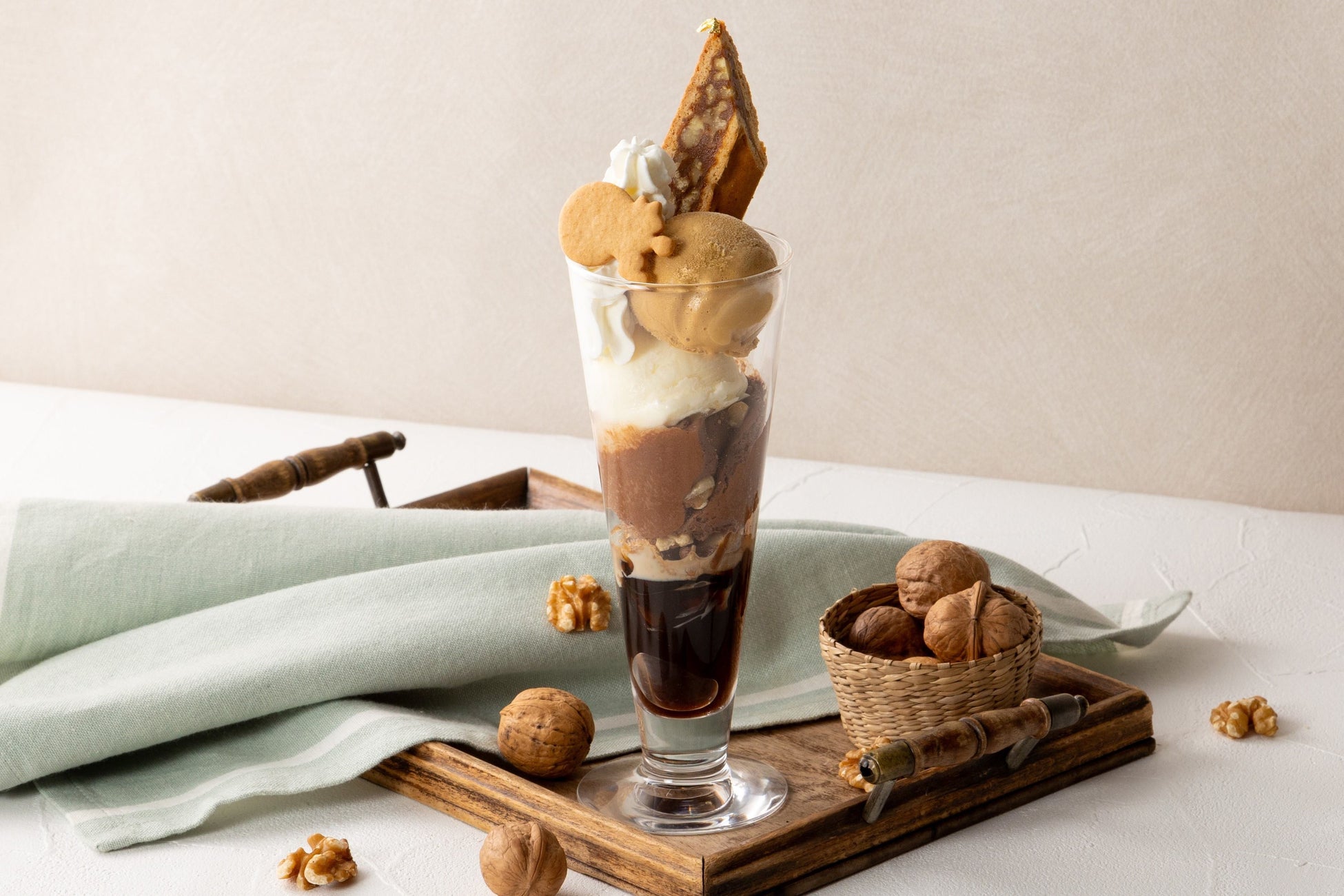 塩キャラメルアイスとミルクアイス、クルミ、チョコレートムース、コーヒージュレ等が入った、パフェとして再構築されたクルミッ子をお楽しみください。(税込1,595円 )