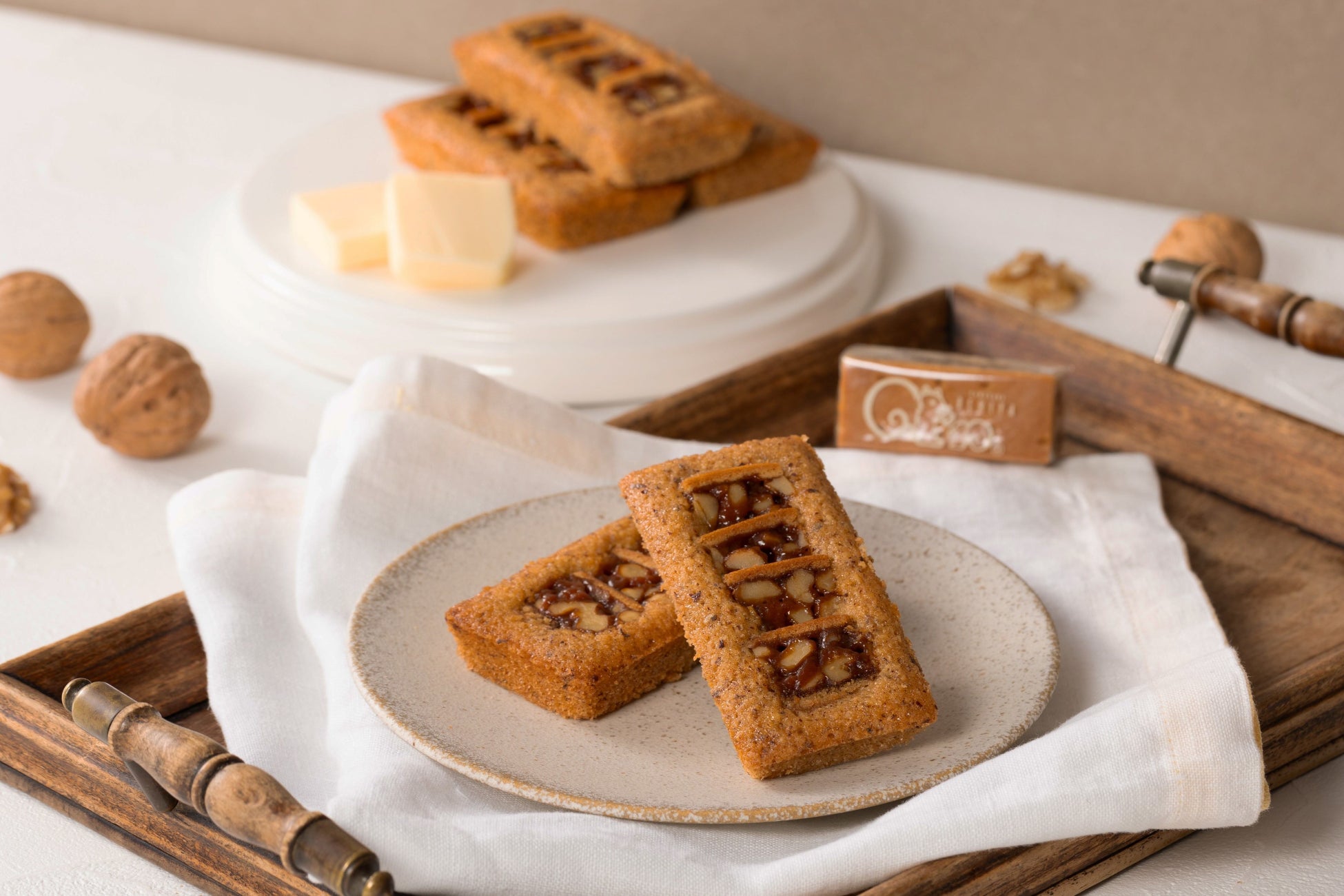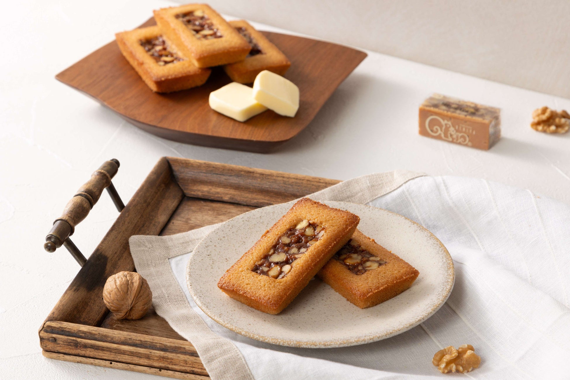外はカリッと中はしっとり焼き上げたフィナンシェに、クルミッ子のキャラメル部分のみをトッピング。それぞれのおいしさが一番引き立つように仕上げました。(税込330円)(*)