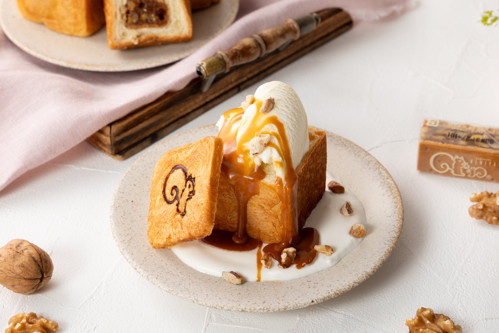 さっくり食感のデニッシュでクルミッ子を包みました。ミルクアイスやクルミッ子のキャラメルソースと一緒にお召し上がりください。(税込880円)