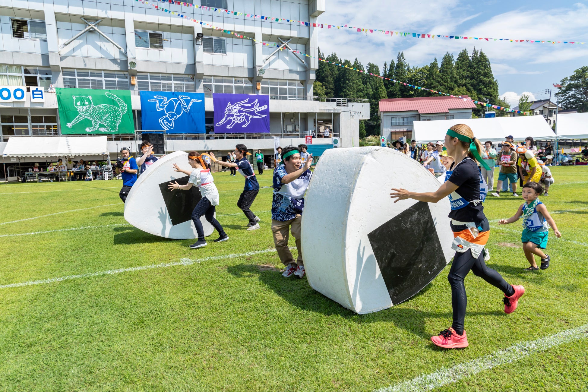 その理念のもと地域に実装された「大地の運動会」は日本独自の運動会を再解釈し、多様な人々が身体を通して交流する場をつくり出している。在住の外国人を含む多様な人々が同じチームで競技し、応援し、食事を共にし、互いの息づかいを分かち合う時間は、共に生きる感覚を身体で実感できる特別な体験であり総合芸術活動である。