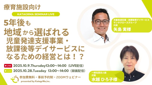 株式会社カタグルマ(本社:東京都千代田区、代表取締役:大嶽広展)は、この度、児童発達支援・放課後等デイサービス(以下、療育事業)の経営者・管理者様、今後療育的な視点を保育に取り入れたい方を対象としたオンラインセミナーを、2025年10月9日(木)と10月28日(火)に開催いたします。