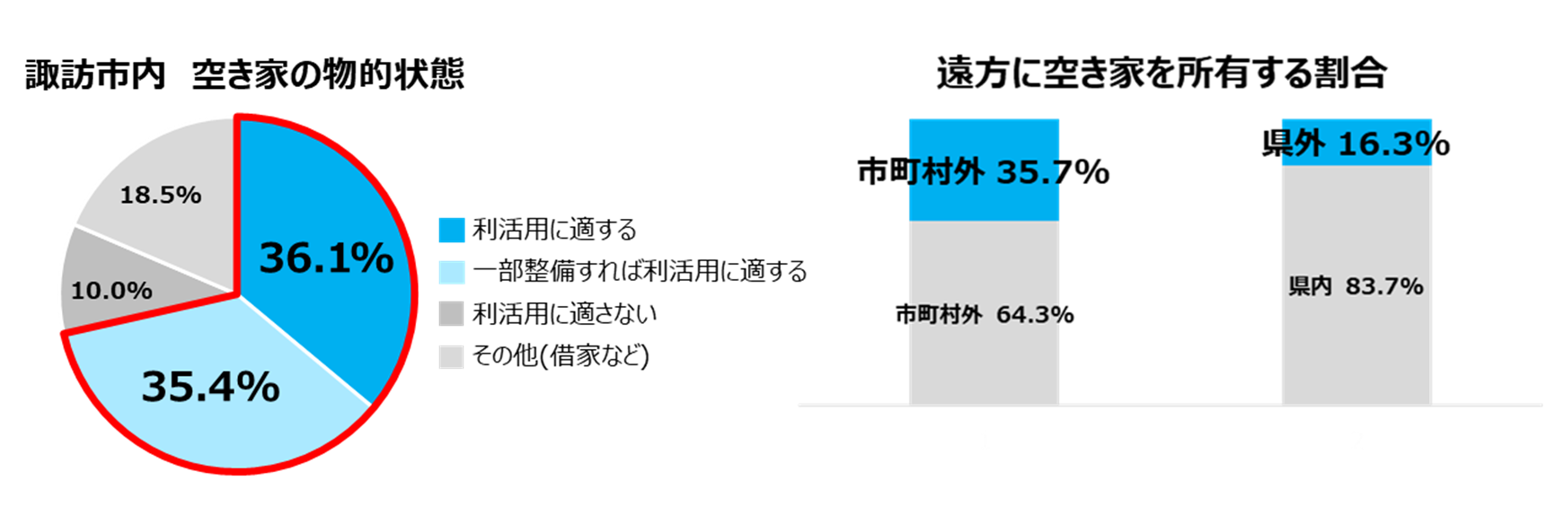 今回新店舗を構える諏訪市は、利活用に適する空き家が7割以上存在すると言われながらも、空き家のまま活用されていません*²。さらに長野県に空き家を所有する人のうち、6人に1人は県外に居住し、3人に1人の割合で空き家の存在する市町村県外に居住します*³。遠方に空き家を所有する場合、空き家の維持管理のコストの負担は大きくなる上に、利活用の促進を妨げる要因の一つでもあると考えます。