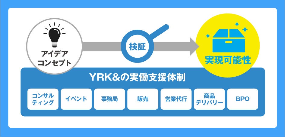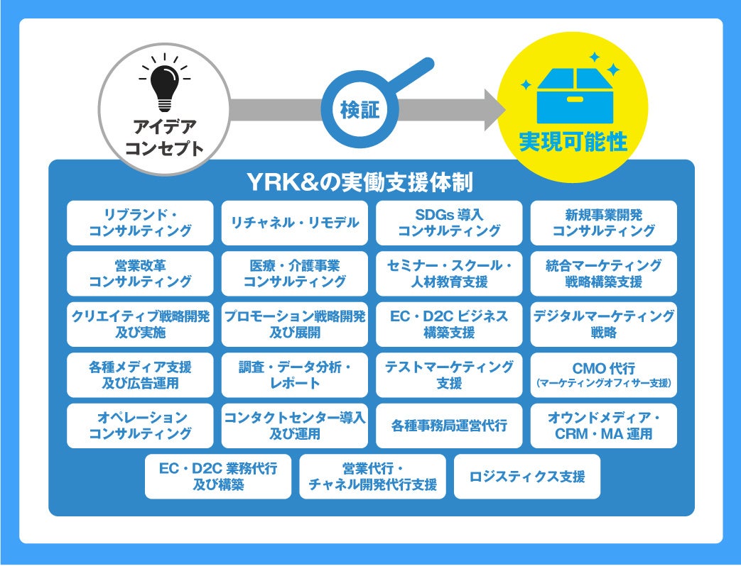 PoC(Proof of Concept:概念実証)とは、新たなアイデアやコンセプトの実現可能性やそれによって得られる効果などについて検証することです。YRK&では、コンサルティング支援で立ち上がった新しいコンセプトを軸に、様々な実施人材を確保し、事務局や営業代行、商品デリバリーやイベント、販売などまで一連のサポートを行う実働支援が可能。新規事業を創出する際、最も重要となる実働部分をBPO(ビジネスプロセスアウトソーシング)することで、テストマーケティングからの立ち上げをフルサポートします。