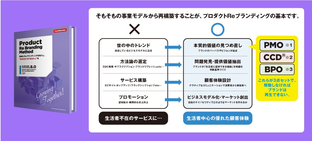 同時リリースとなる“プロダクトリブランディング8.0” は、商品やサービスのブランド力強化をメインに、旧来のマス広告に頼らないコンパクトなコミュニケーション戦略「CCD®️(コンパクトコミュニケーションデザイン)」を提供。ブランド戦略の磨き直しから、一気通貫で実働までのトータルなブランディング支援を行います。