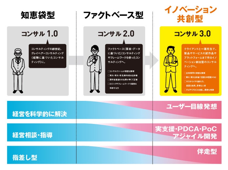 「実働の伴走支援」をできることが、旧来型のコンサルティングとの違い。