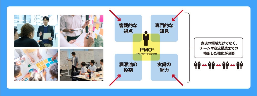 ※1 PMO(Project Management Office支援):生活者と同じドライな目線から客観的に現在の状況を捉え、個々のプロジェクトのマネジメントを横断的に支援し、求心力と一貫性を創造します。