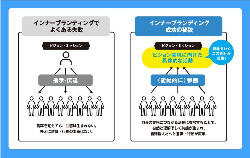 新しく定めたMVV(ビジョン・ミッション・バリュー)を社内に浸透させていくことが重要になりますが、いずれも当事者意識を高めることが肝心になります。そのためには、”社員浸透させる事”を主軸に置くのではなく、“従業員と共にビジョンを実現させるプロジェクト”という考え方でインナーブランディングを進めることが不可欠となります。